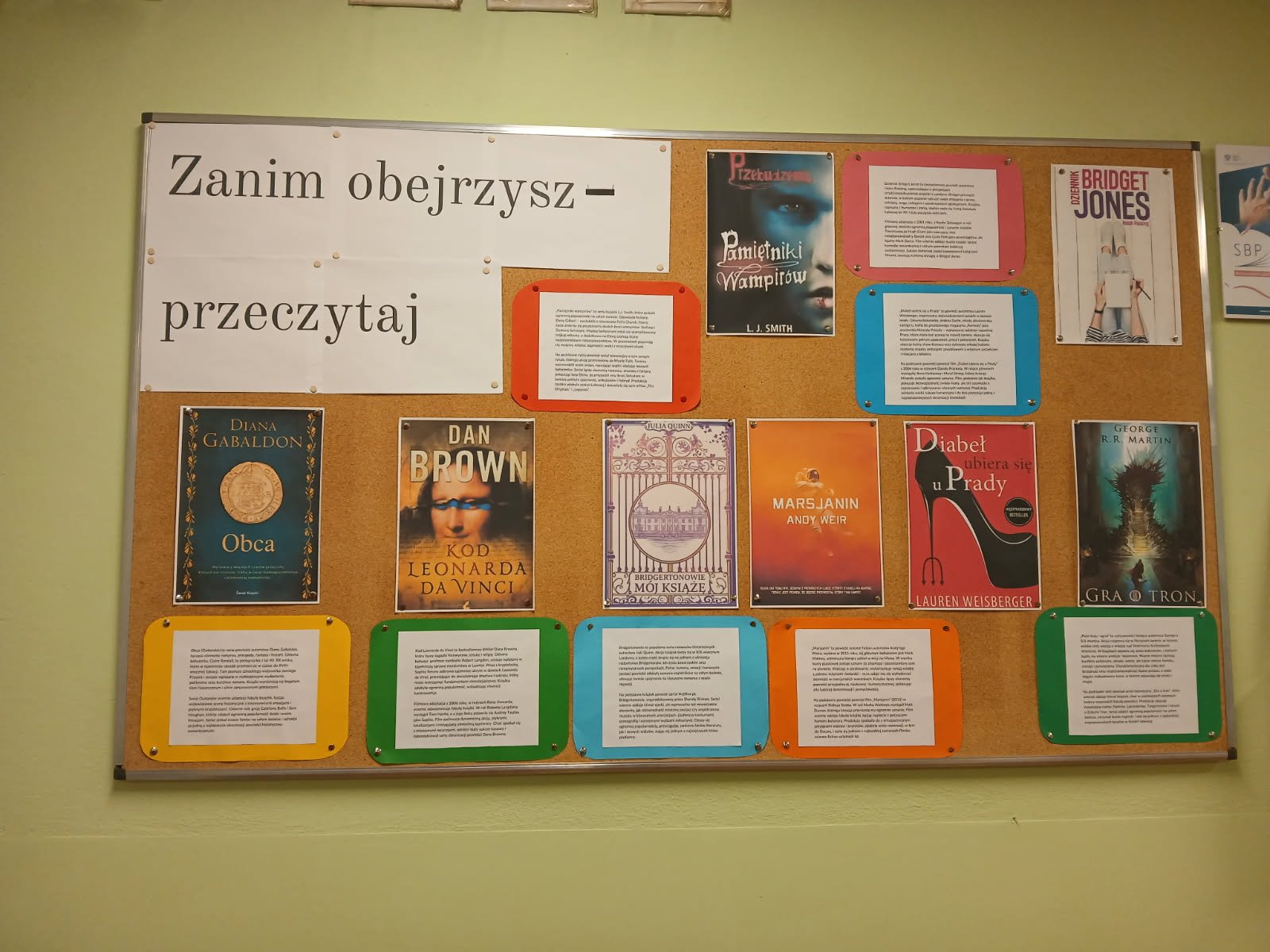 Dominika Krajewska i Kinga Strugała kolejny raz włączyły się w akcję czytelniczą realizowaną w naszej bibliotece. Tym razem uczennice – w formie gazetki ściennej – przygotowały prezentację pod tytułem „Zanim obejrzysz, przeczytaj".