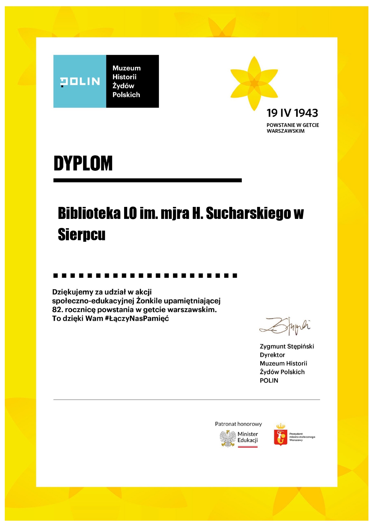 Muzeum Historii Żydów Polskich POLIN kolejny raz doceniło nasze zaangażowanie w akcję społeczno - edukacyjną Żonkile. Za udział w tegorocznym projekcie otrzymaliśmy podziękowania i pamiątkowy Dyplom.