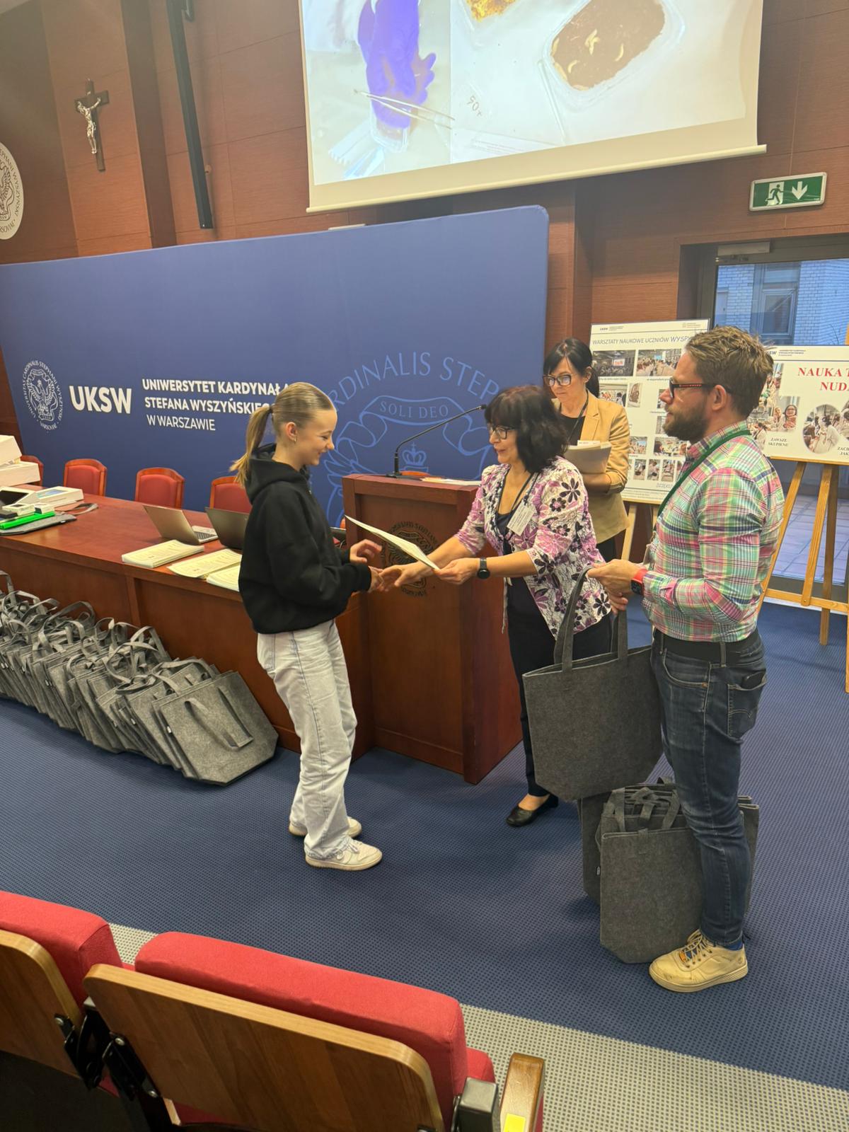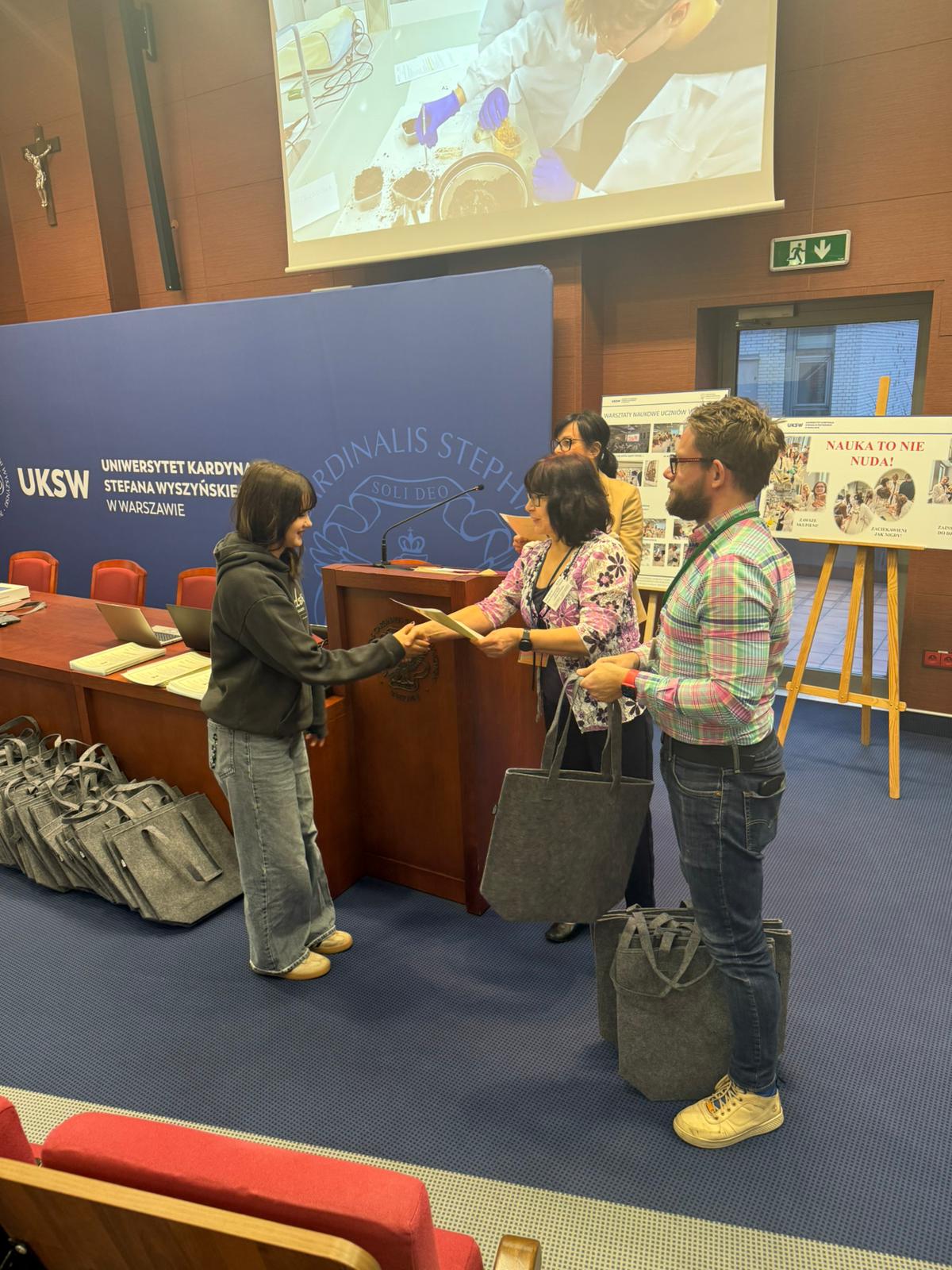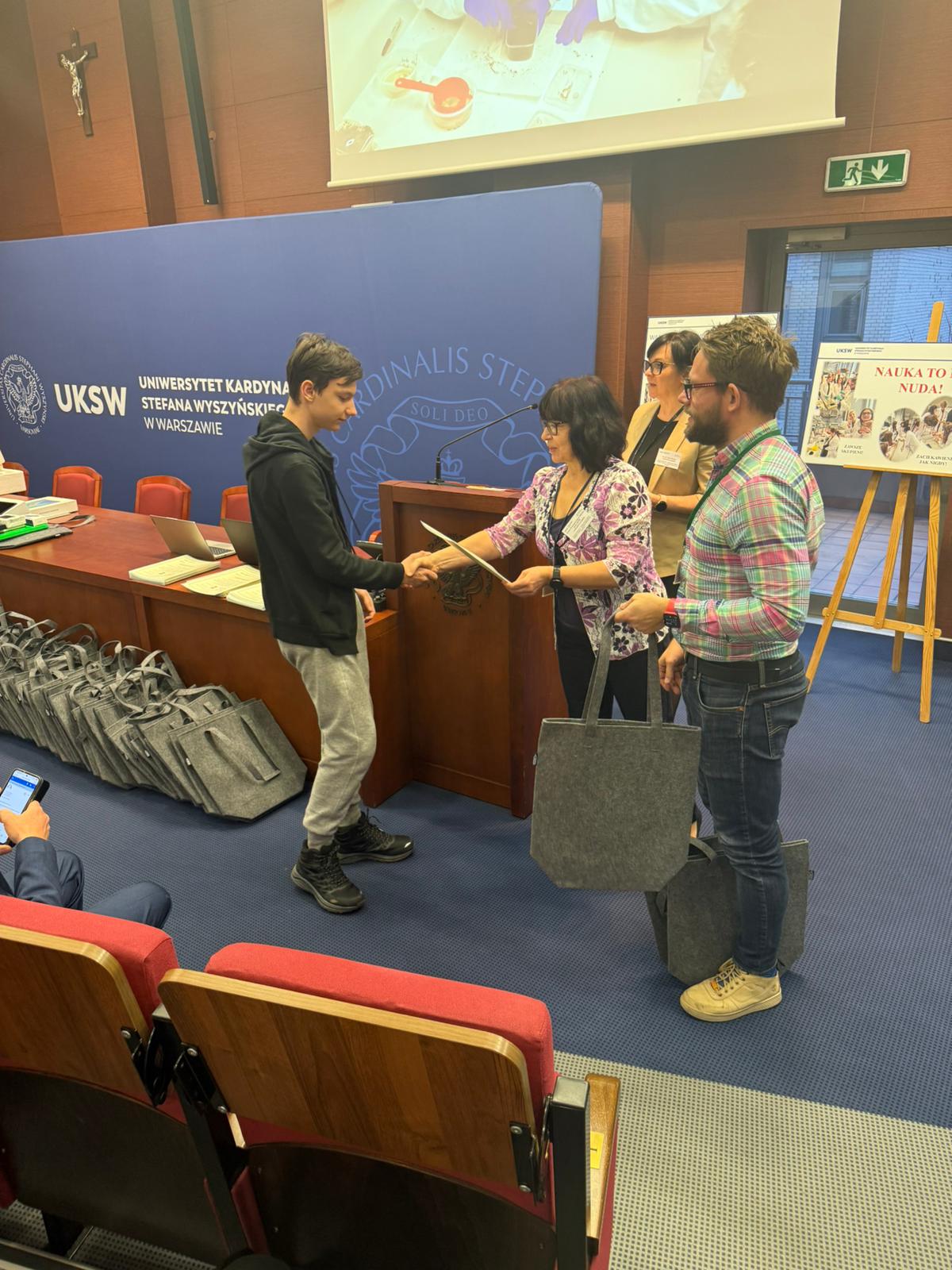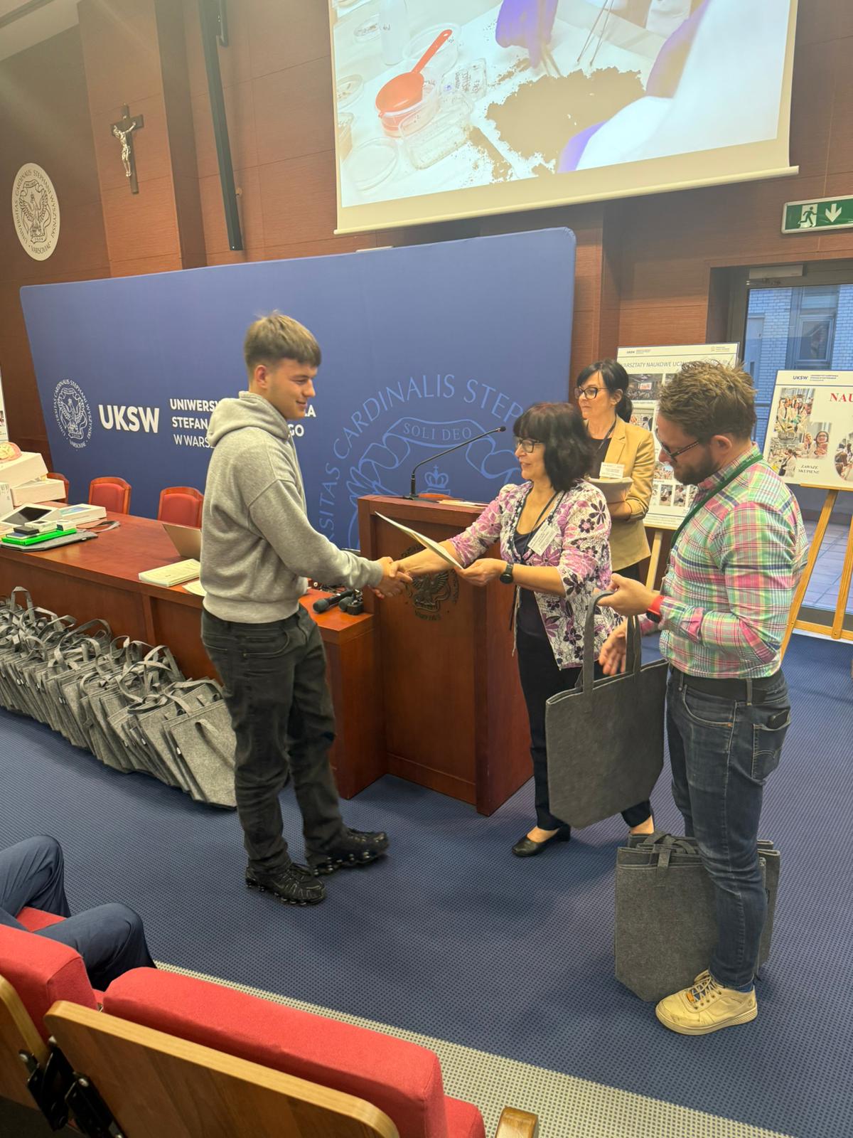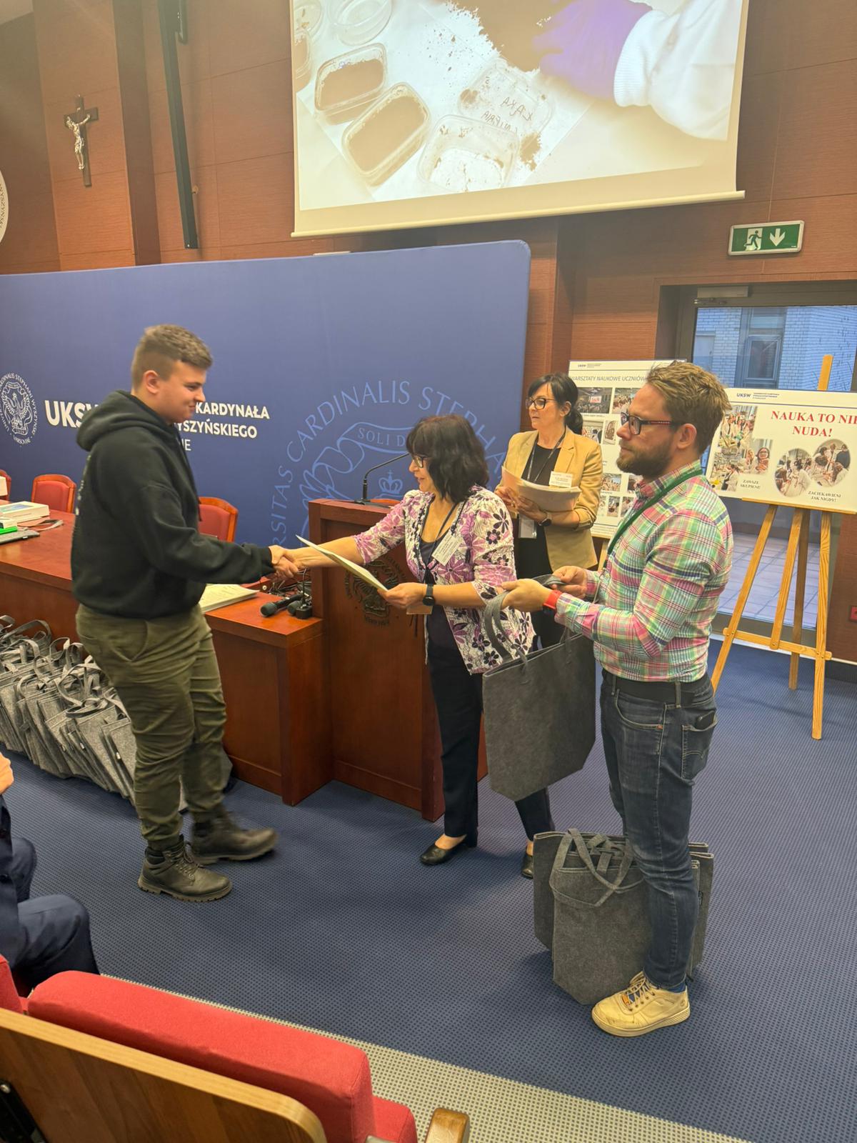Następnie głos zabrał Ksiądz Dziekan, który skierował do młodzieży kilka słów refleksji i zachęty do dalszego rozwijania pasji naukowych. Po swoim wystąpieniu dokonał również uroczystego przekazania pomocy dydaktycznych zakupionych w ramach projektu, które będą służyć uczniom w dalszej pracy badawczej i edukacyjnej.