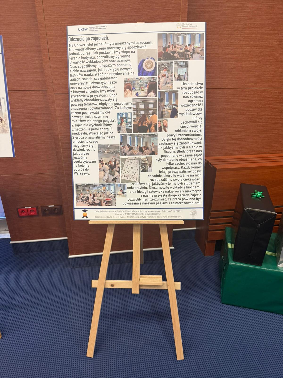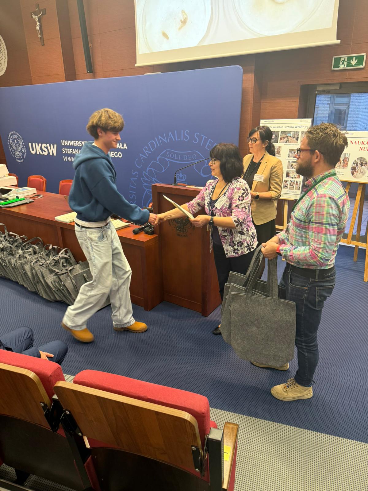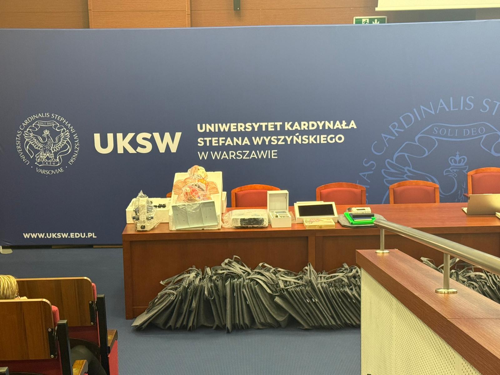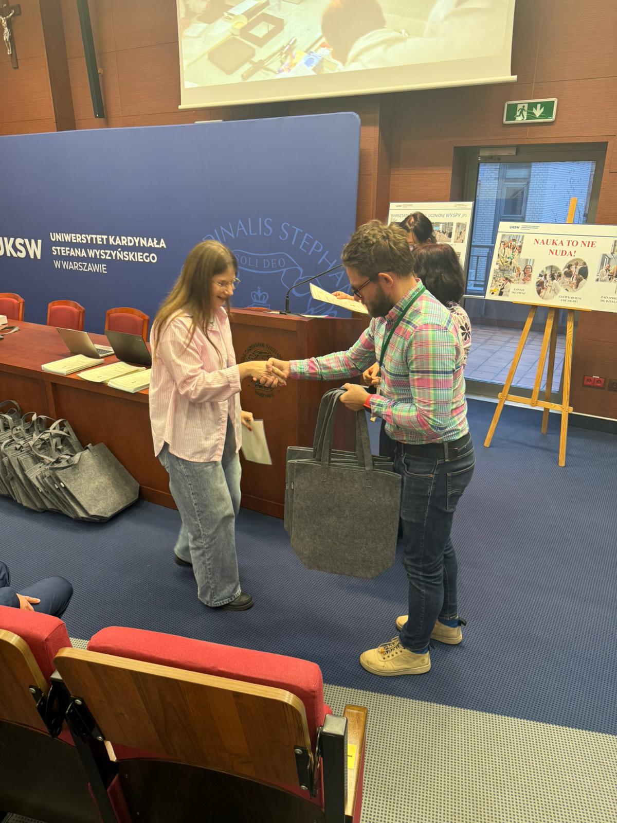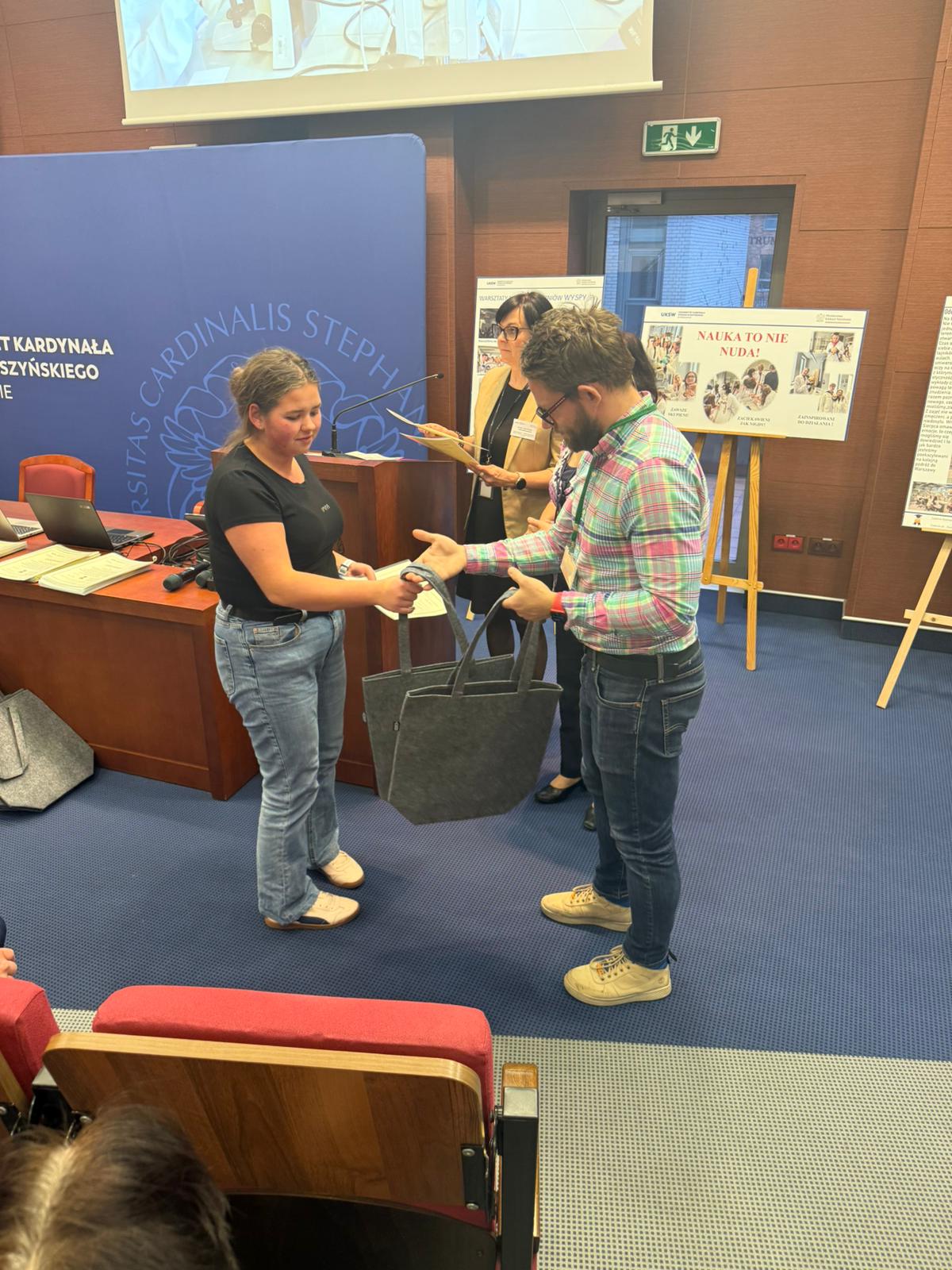 Następnie głos zabrał Ksiądz Dziekan, który skierował do młodzieży kilka słów refleksji i zachęty do dalszego rozwijania pasji naukowych. Po swoim wystąpieniu dokonał również uroczystego przekazania pomocy dydaktycznych zakupionych w ramach projektu, które będą służyć uczniom w dalszej pracy badawczej i edukacyjnej.