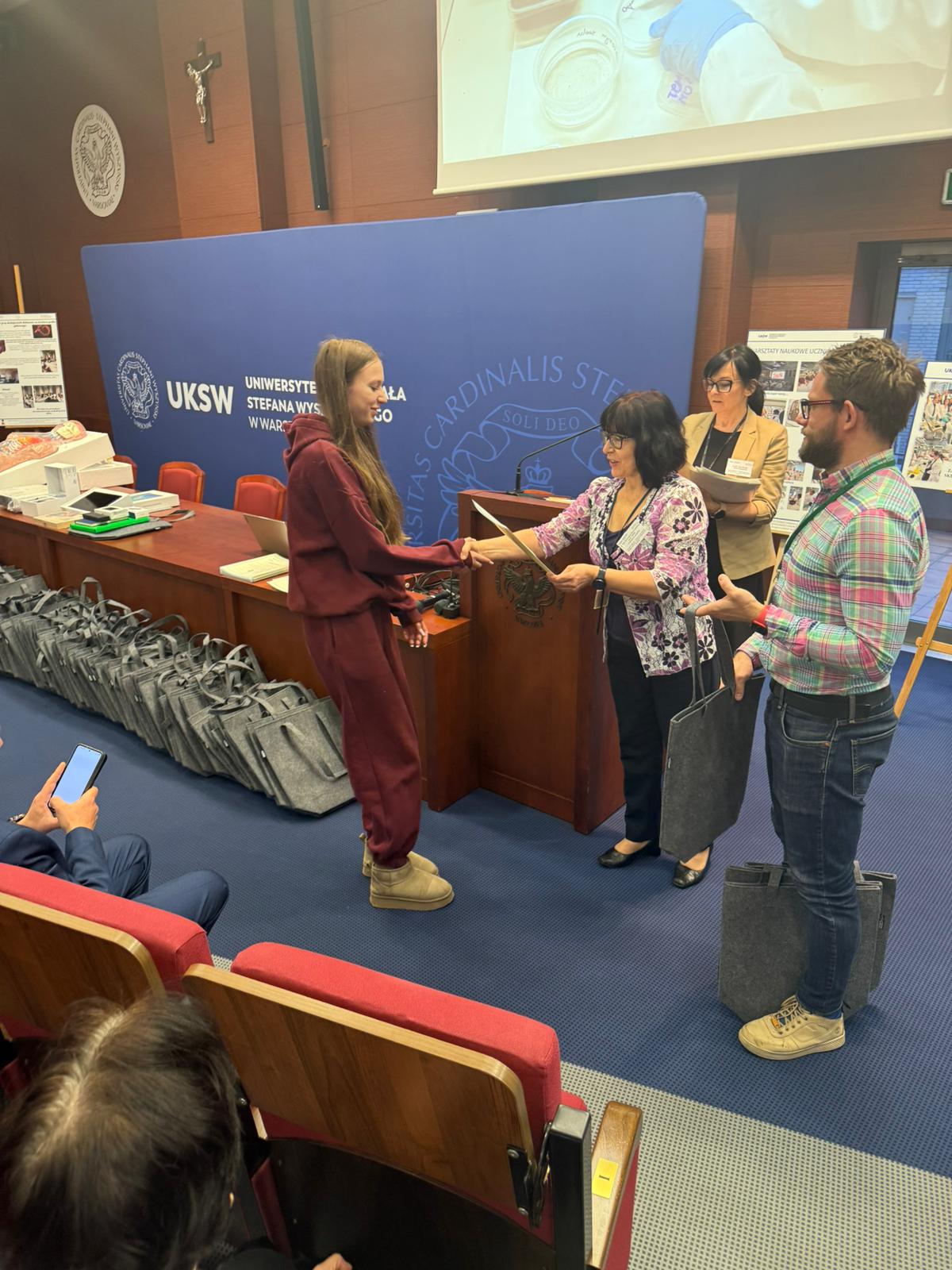 Kolejnym punktem programu było wręczenie certyfikatów uczestnictwa w warsztatach „Biologia w praktyce”. Każdy z uczestników otrzymał imienne potwierdzenie udziału oraz pamiątkowe materiały dydaktyczne.