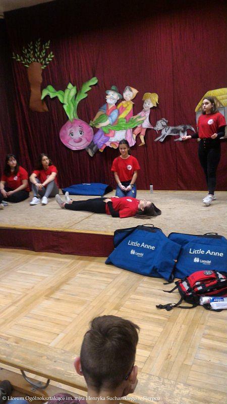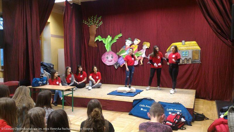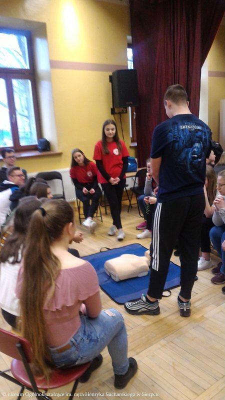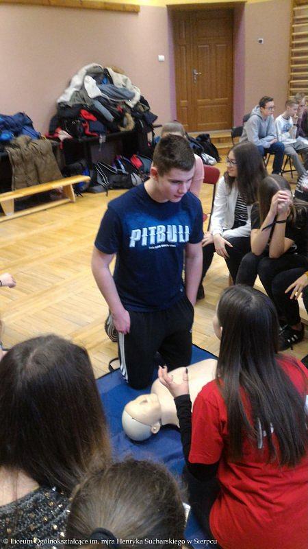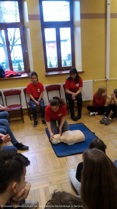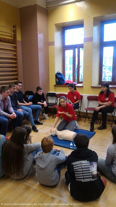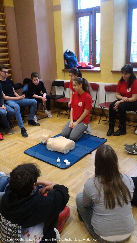 Drużyna w składzie: Klaudia Browarek, Alicja Budka, Joanna Cholewińska, Agnieszka Czarnecka, Marta Krokosz, Julia Skierska i Julia Wilkowska, przeprowadziła szkolenie z zakresu Pierwszej Pomocy. W pierwszej części kursu odbył się krótki wykład połączony z pokazem dotyczącym podjęcia akcji ratowniczej, poprawnego telefonicznego zgłoszenia służbom medycznym o zajściu oraz przeprowadzenia resuscytacji krążeniowo-oddechowej. W drugiej części uczniowie klas 8 a, b i c wykonywali ćwiczenia na fantomach.