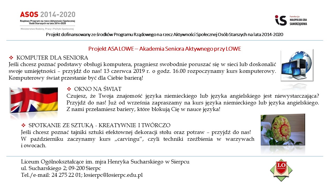 Głównym celem projektu jest wzmocnienie aktywności społecznej, edukacyjnej, twórczej i zdrowotnej osób powyżej 60 roku życia na terenie działania 10 ośrodków LOWE. Przedsięwzięcie jest kontynuacją projektu „Lokalne Ośrodki Wiedzy i Edukacji na rzecz aktywizacji osób dorosłych”. Wówczas od 25 listopada 2017 r. do 17 czerwca 2018 r. – z różnych form wsparcia – skorzystały 173 osoby dorosłe.